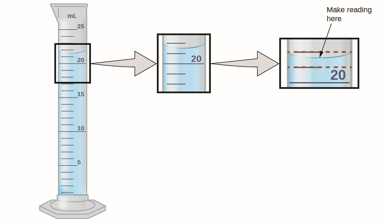 We know by inspection that the water is clearly greater than 21 mL but less than 22 mL. We estimate that the water is perhaps 21.6 mL (at the meniscus).