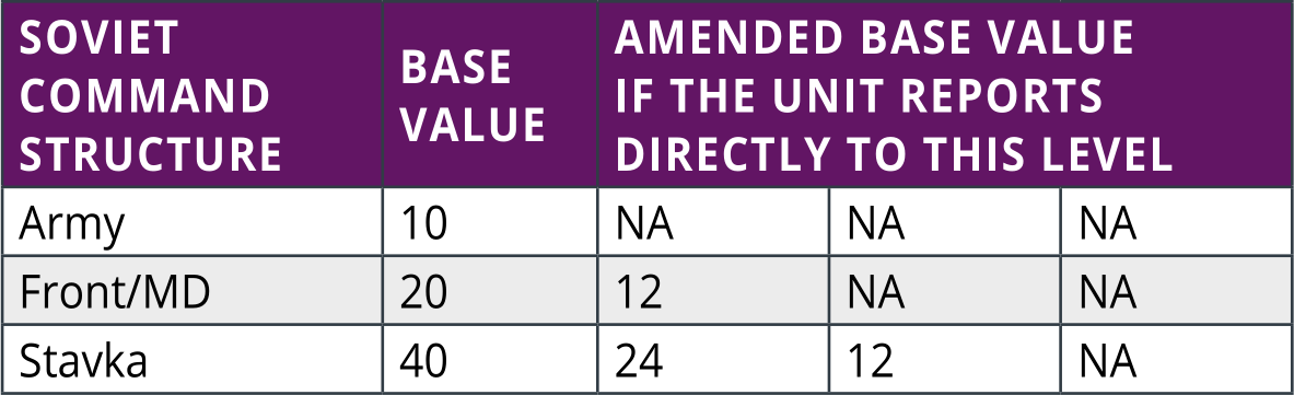 The chance to pass a check is dependent on how a unit reports to the chain of command. The expectation is that Axis units will report to a Corps HQ and that, after August 1941, Soviet units will report to an Army HQ.