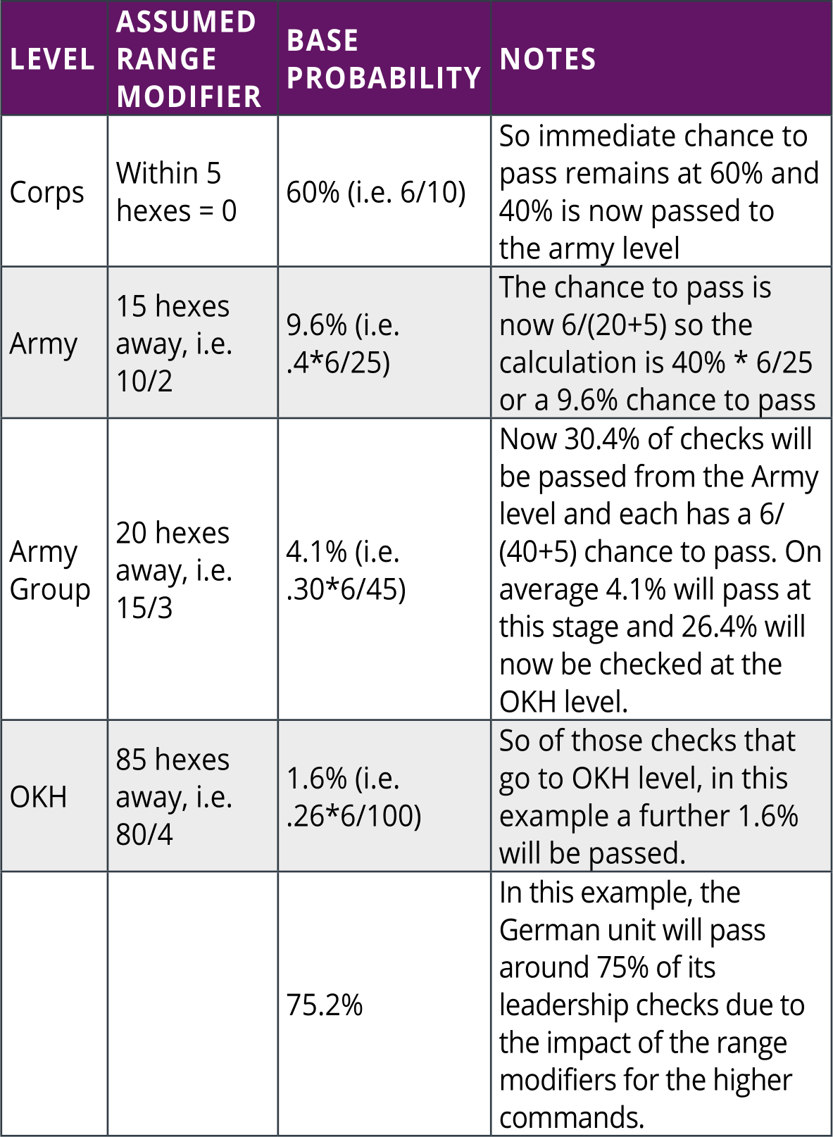 For example a German unit attached directly to OKH (High Command headquarters unit) will have one leader check at the value of 10+2. The same unit attached to a Corps could have up to four leaders conduct the check at the Corps, Army, Army Group and OKH levels.