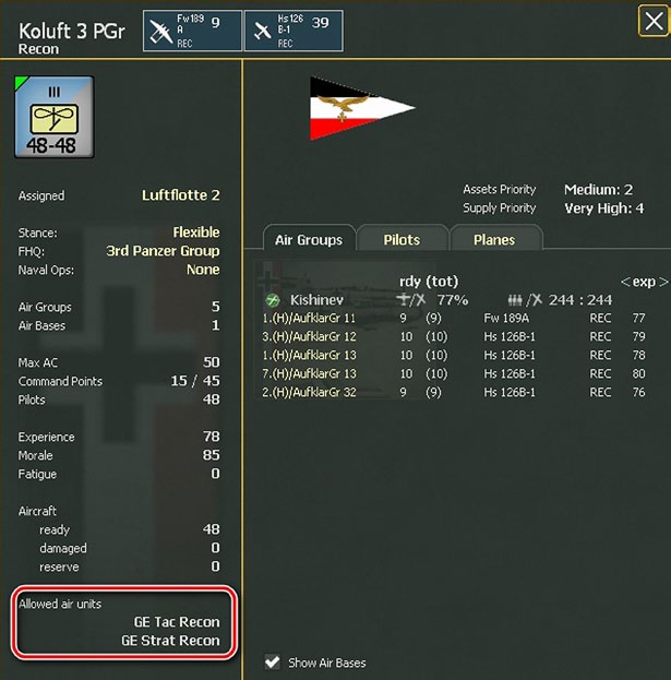 Certain plane types can only be assigned to particular types of Air Operational Groups. Both sides can only assign transport and reconnaissance air units to the appropriate AOGs. These constraints effectively follow the air profiles (16.4.6) that are also used to limit the conversion of planes as new models become available.