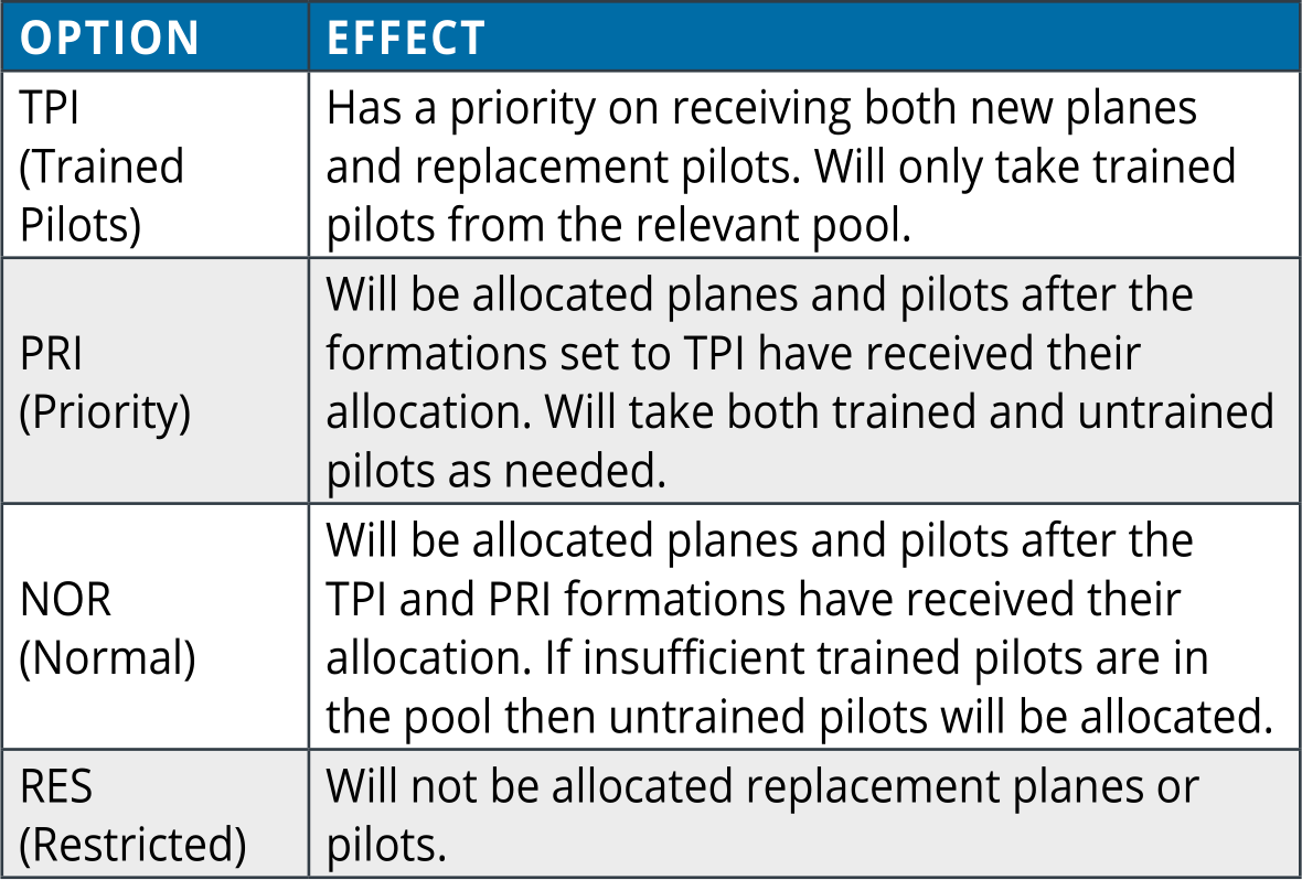 Note that units set to TPI will also acquire pilots who were previously assigned to an air group but who are now in the pool. These might have relatively low experience levels compared to that of newly trained pilots (16.7.2) especially if the air group was disbanded relatively soon after being formed. On the other hand, such pilots might have high experience levels due to sustained combat experience.