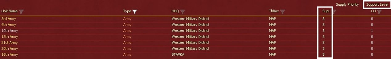 - Total Support: Total support used (organic plus HQ help) by units in the chain of command under this HQ during last logistics phase.